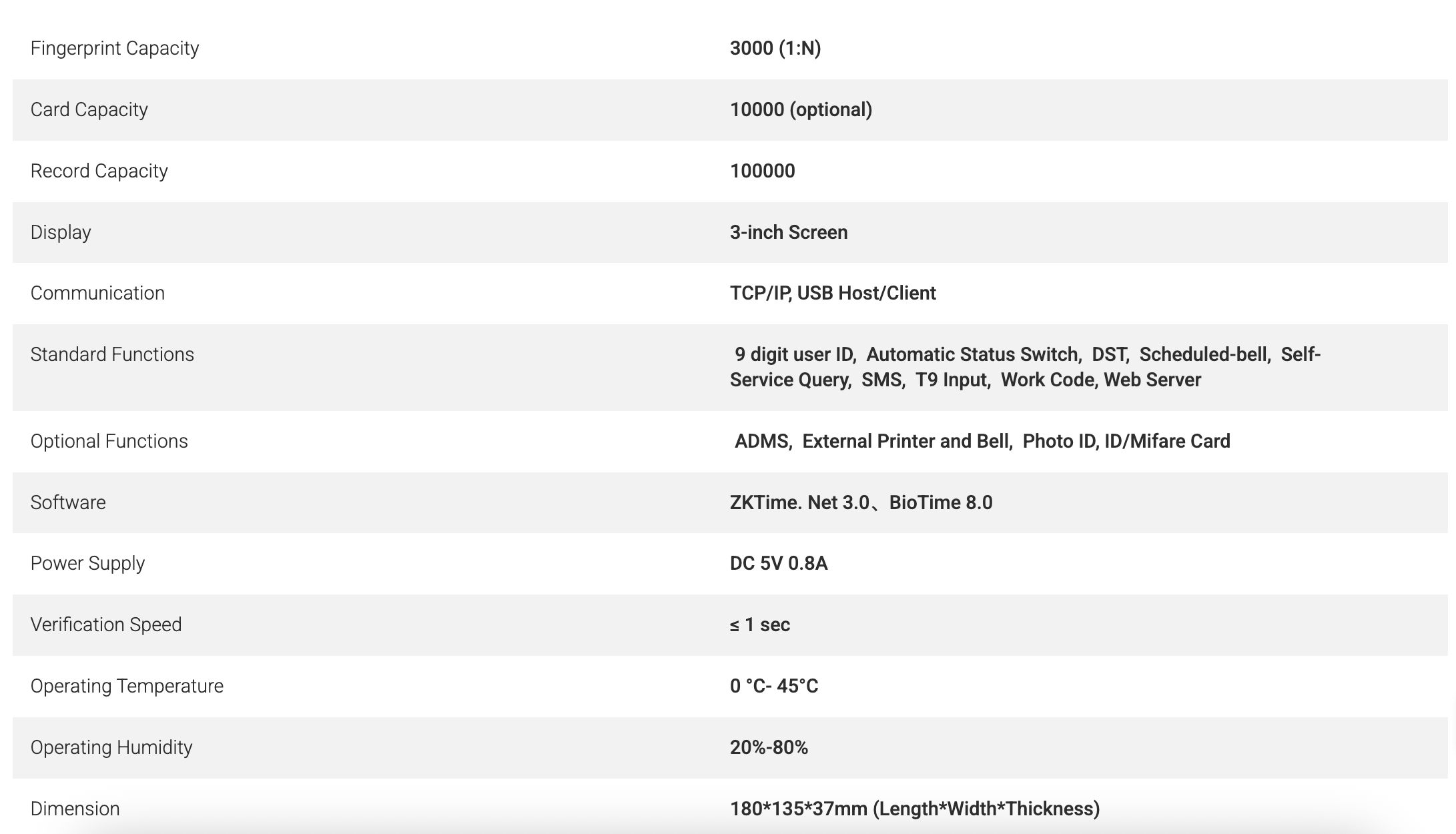 - Supports up to 3,000 fingerprint templates and 100,000 log records